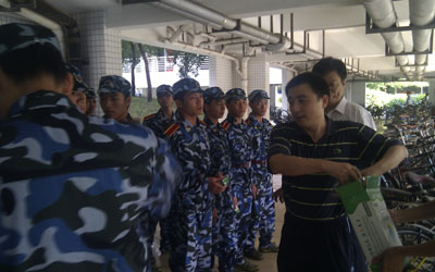 2011年9月7日下午,体育健康学院潘华山院长、宋述财书记和学工办主任杨麟老师一同前往军训营看望2011级新生并慰问教官。潘院长代表体育健康学院欢迎2011级新生,对同学们在军训中表现出的精神面貌表示赞扬,并勉励同学们继续刻苦训练,用优异的军训成绩向学院,向学校汇报。最后,学院领导给新生和教官派发慰问品并感谢教官的严谨、辛勤的工作。