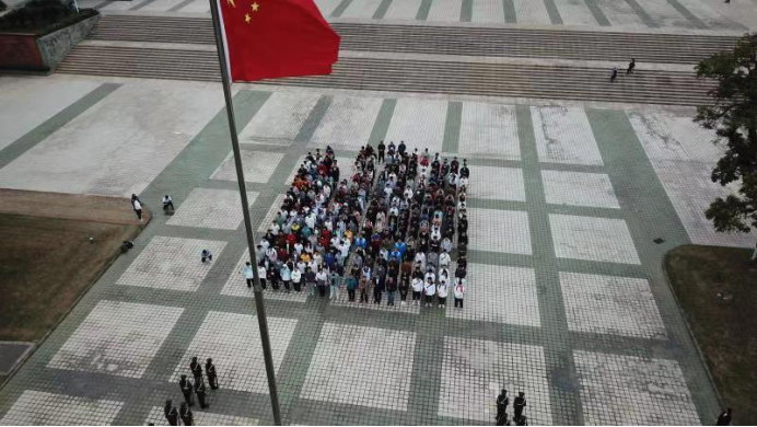 上午7:30伴随雄壮的国歌声,五星红旗冉冉升起,全体师生面向国旗行注目礼,全场庄严肃穆。升旗仪式后,全体师生合唱“没有共产党就没有新中国”和“团结就是力量”。