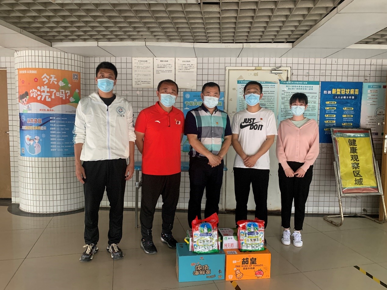 3月17日下午,体育健康学院李兆伟副院长,杨麟副院长,曹喜俊副书记与党政办,学工办老师到国际楼慰问学院隔离留观的2名学生。在慰问现场,学院领导叮嘱医护工作人员把学院的关心和问候送达给学生。同时学院领导通过辅导员老师了解与询问同学的健康、餐饮以及学习等情况,并嘱咐隔离同学严格遵守防疫隔离要求,做好自身防护。