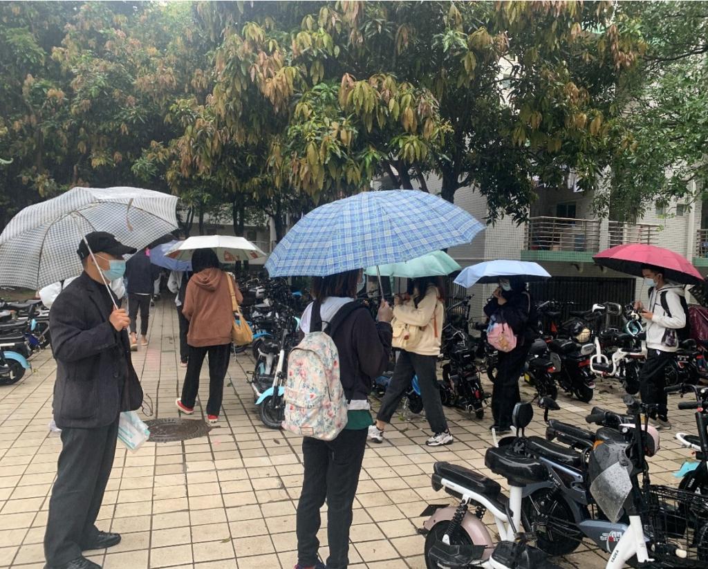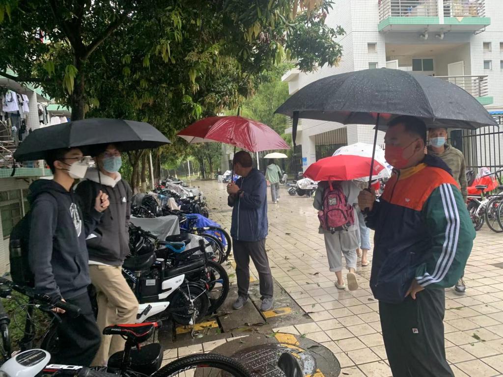 院领导班子与辅导员,班主任不受风雨阻挡,在大雨中坚守岗位,在学院学生所在宿舍楼下提醒督促学生戴好口罩,到教学楼检查学生上课佩戴口罩情况,一句句叮嘱,一声声督促,都是在守护师生的健康安全。