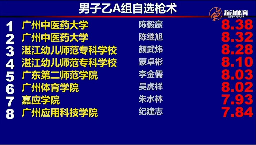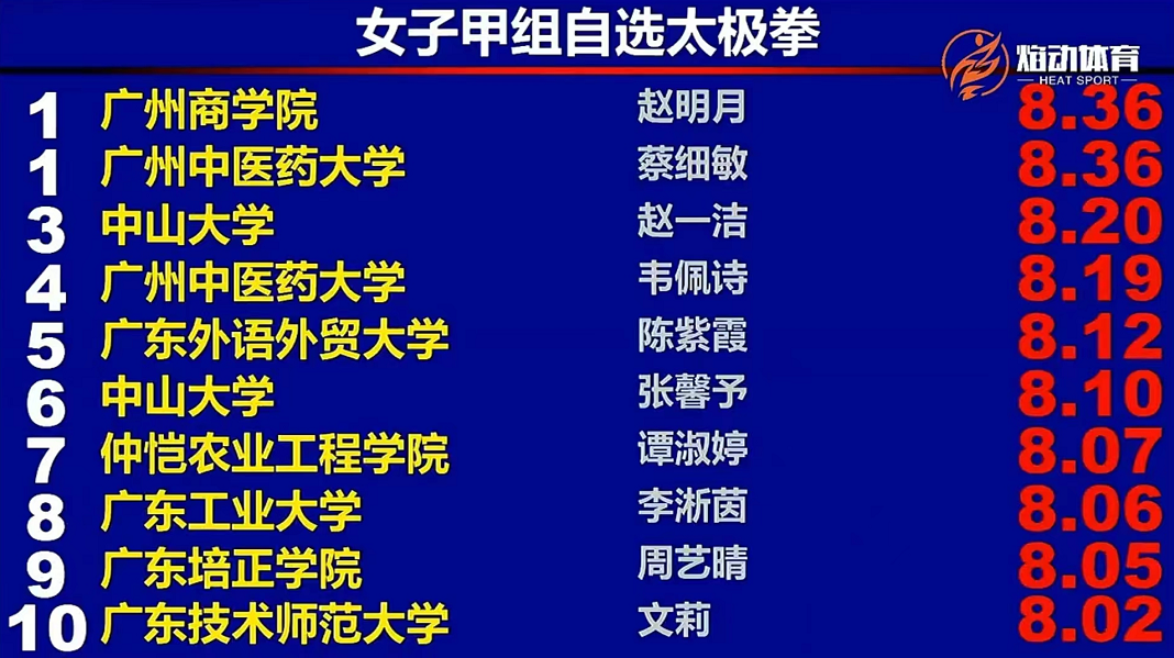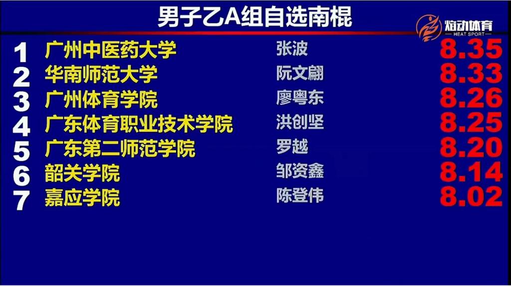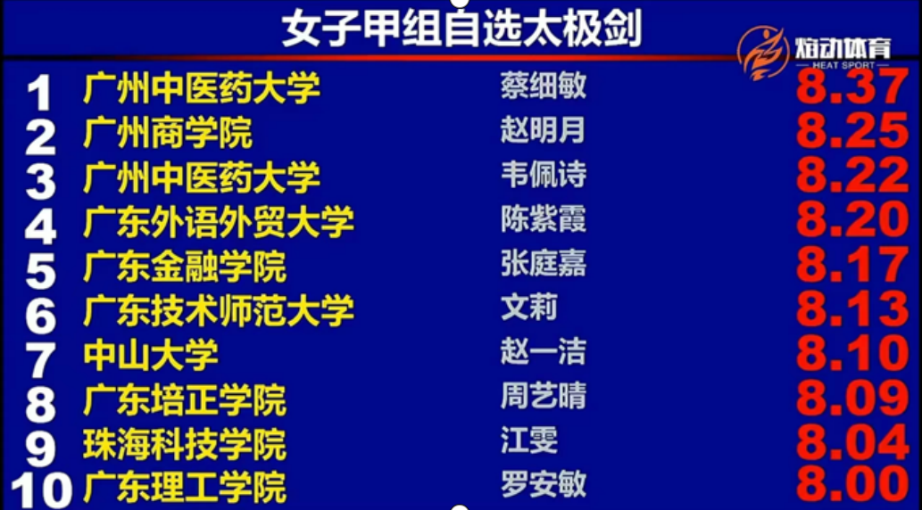 热烈祝贺蔡细敏同学夺得广东省第十一届大学生运动会武术套路比赛女子甲组自选太极拳、女子甲组自选太极剑金牌、林贤灿同学夺得男子甲组自选太极拳金牌、李颖琳同学夺得女子乙A组自选枪术金牌、刘溯毅同学夺得女子甲组自选棍术金牌、张波同学夺得男子乙A组南棍金牌、陈毅豪同学夺得男子乙A组自选枪术金牌!