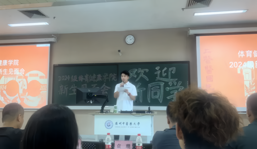 2024级梁逸朗同学作为新生代表上台发言。梁逸朗同学以真诚而激昂的演讲,分享了对未来的憧憬与梦想,表示将深入学习体育理论知识,掌握科学的训练方法,同时融合中医药的精髓,努力成为一名既有扎实专业技能,又具备良好人文素养的体育教育人才。