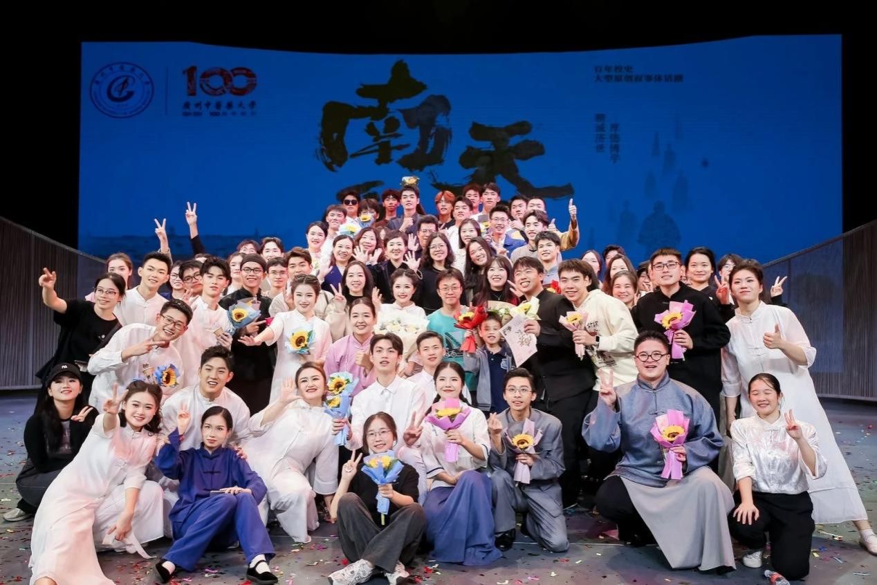 在建校百年办学成果文艺展演中,体院师生大放异彩。在武术舞蹈《天行健·少年当自强》中,24 位同学用精彩的表演展现了中华武术的魅力与青年的蓬勃朝气。舞蹈《龙出海》以 2024 级体育教育专业 36 名同学为班底,他们的活力演绎仿佛让观众看到了汹涌澎湃的海浪,感受到了中医药文化走向世界的勃勃生机。7位同学参与话剧《南天医薮》的演出,用生动的演绎传达了对广中医百年历史的敬意和对中医药文化的热爱。