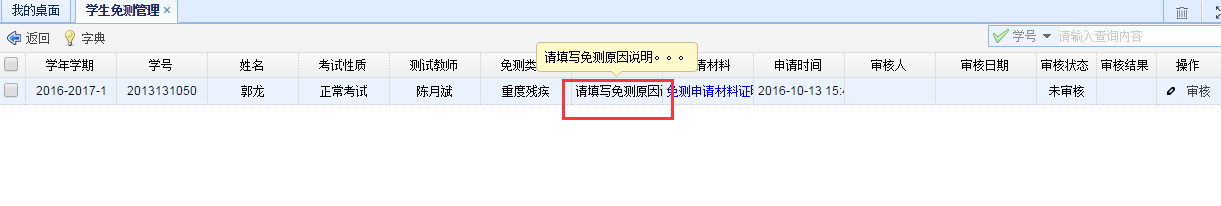 鼠标移至申请原因可查看学生的免测申请原因说明。