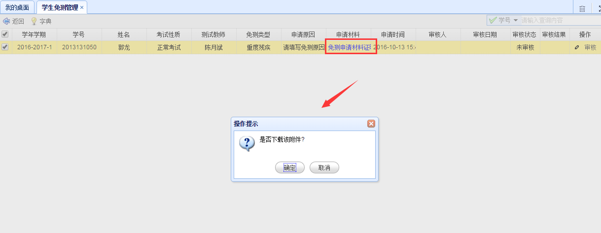 2. 学生免测申请情况查询及审核。如下图:
