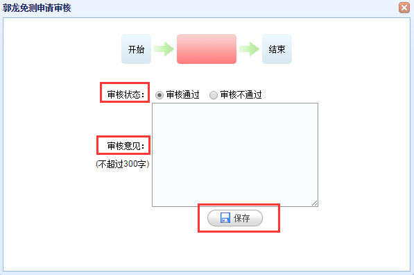 选择是否审核通过及审核意见,点击保存即可,学生界面可查询审核结果。