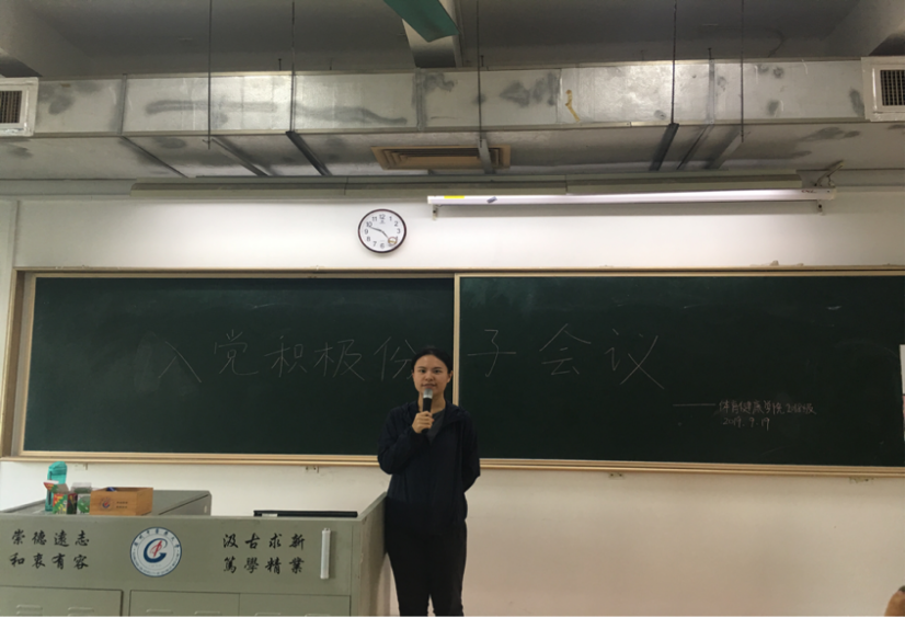 为加强对入党积极分子的培训工作,深化党的基本理论、基本路线、基本纲领和基本经验教育,进一步提高入党积极分子对党的基础理论的认识和理解,体育健康学院2018级第一批入党积极分子培训于2019年9月19日下午四点半在教学楼A310课室进行。