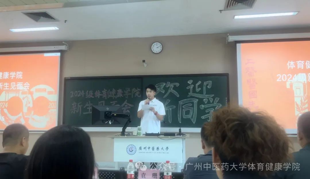 2024级梁逸朗同学作为新生代表上台发言。梁逸朗同学以真诚而激昂的演讲,分享了对未来的憧憬与梦想,表示将深入学习体育理论知识,掌握科学的训练方法,同时融合中医药的精髓,努力成为一名既有扎实专业技能,又具备良好人文素养的体育教育人才。