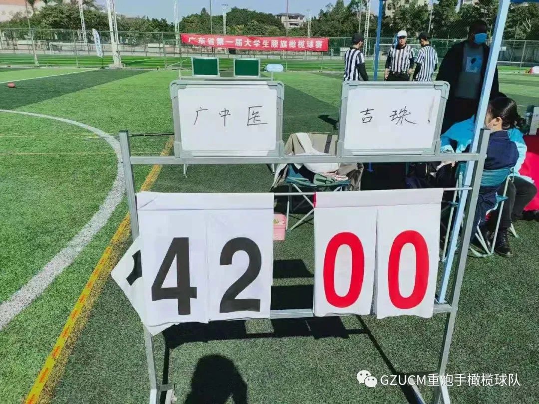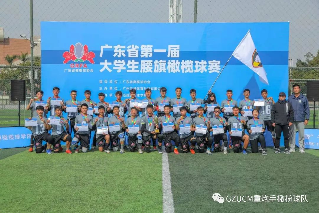 由广州迈越体育科技有限公司主办,迈越橄榄球学院/广州蒙星体育体育发展有限公司/广州英健体育有限公司协办,广东省橄榄球协会指导的广东省第一届大学生腰旗橄榄球联赛于2021年1月3日在广州番禺木生缘球场落幕,最终广中医重炮手对以34:12的绝对优势战胜了广州体育学院,荣获冠军。