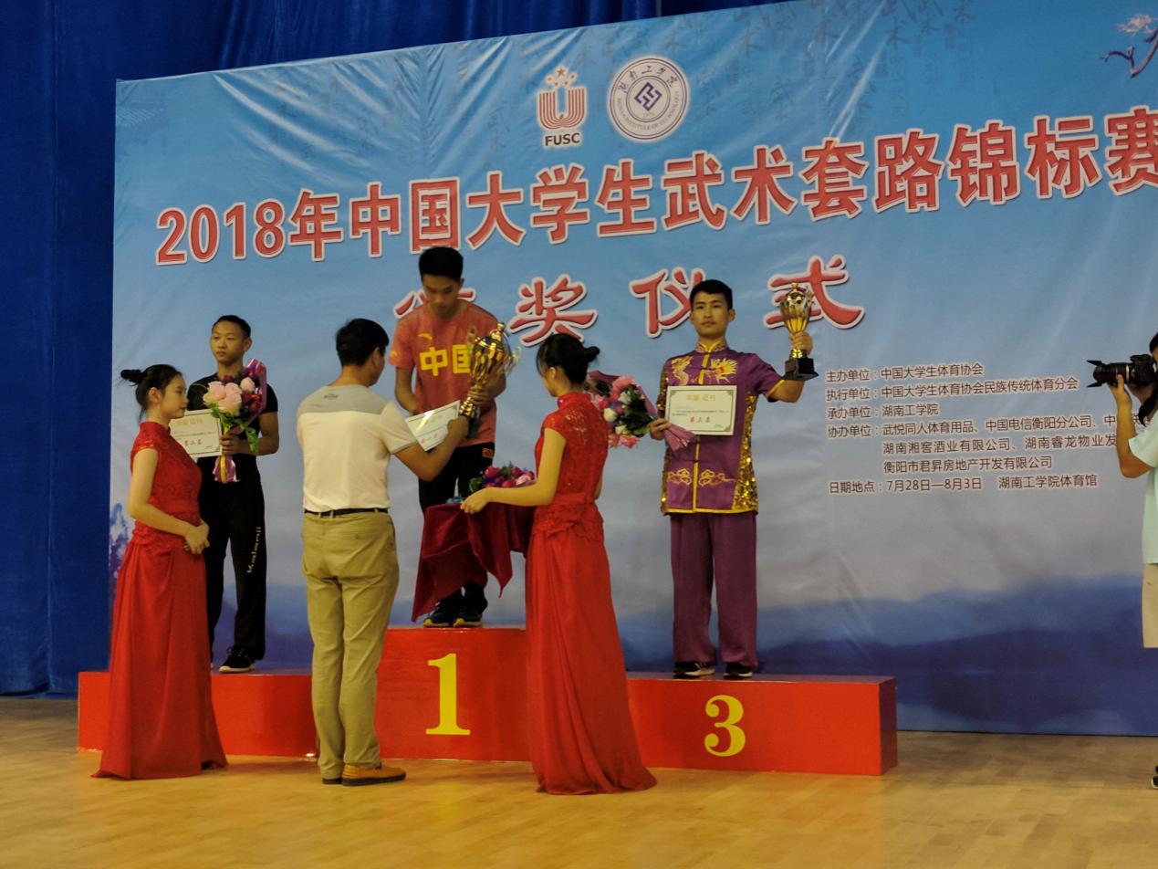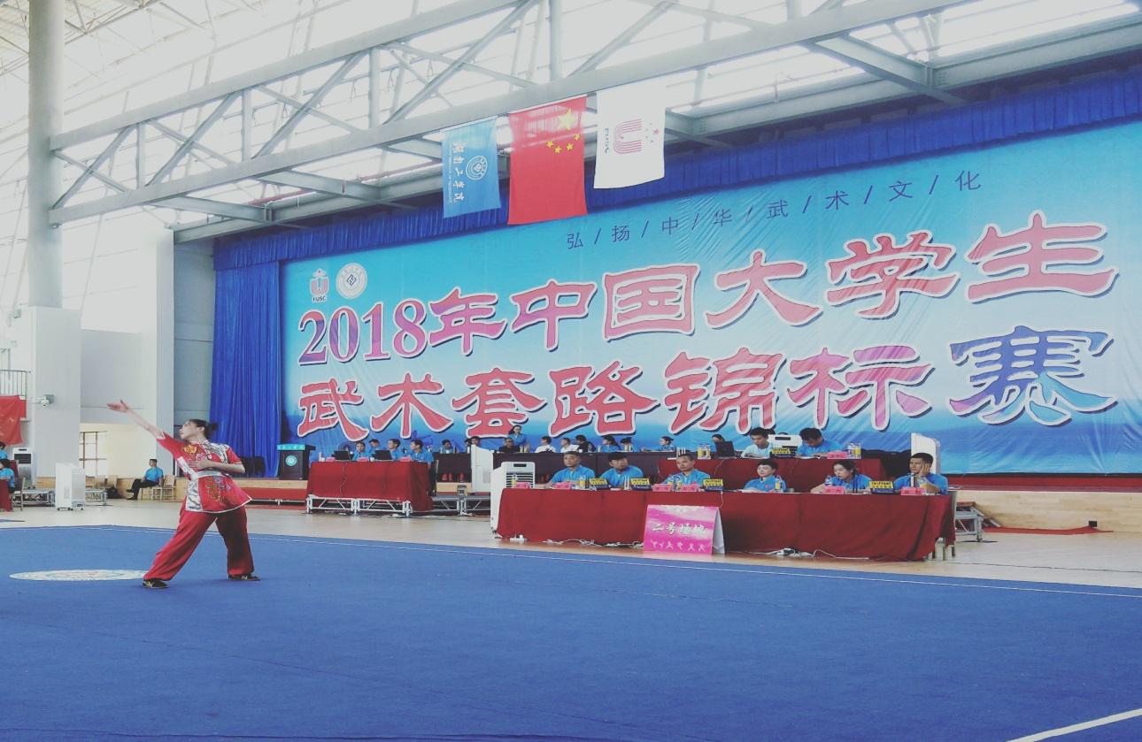 2018年中国大学生武术套路锦标赛于7月28日—8月3日在湖南衡阳市湖南工学院隆重举行。本次赛事由教育部中国大学生体育协会(FUSC)主办,来自北京大学、复旦大学、澳门大学、香港武术联会等全国139所高校、149个代表队1066名运动员参加了自选拳术、自选器械、其他拳术、其它器械、太极拳、械类、对练项目、太极推手等7个大项的比赛。