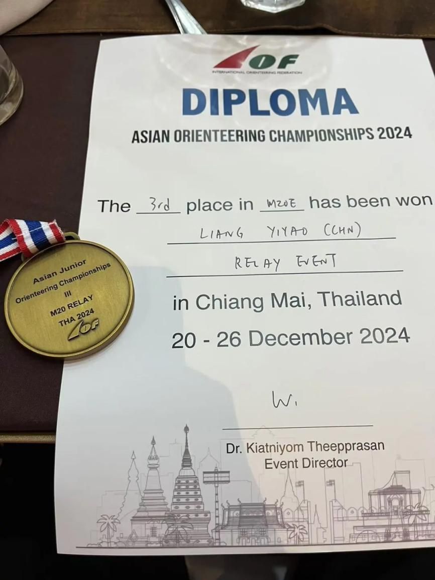该赛事由国际定向总协会主办、泰国定向总协会协办,吸引了亚洲各国众多优秀定向越野选手参赛,竞争十分激烈。比赛现场,清迈复杂的地形以及多变的环境,给选手们带来了极大挑战。梁一耀与队友们无所畏惧,在接力赛过程中,他们配合默契,一棒接一棒奋力冲刺,经过激烈角逐,最终成功斩获第三名。