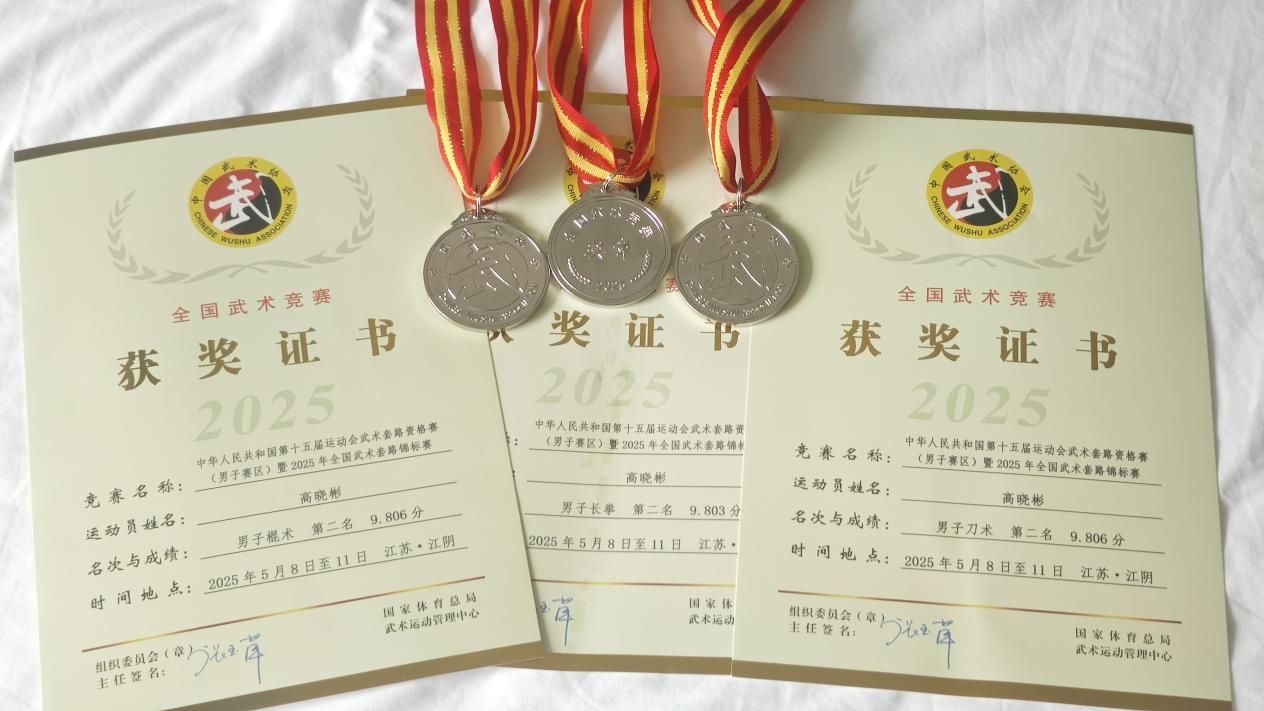 第十五届全运会武术套路资格赛暨2025年全国武术套路锦标赛于5月8日—11日在江苏江阴举行。此次赛事作为世界武术最高水平的赛事,受到了体育界的高度关注。我校武术教师高晓彬分别获男子刀术、长拳、棍术第二名,综合全能第二名,成功获取通往第十五届全运会的宝贵资格!