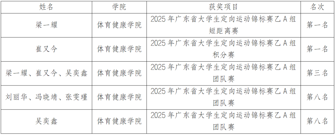 12 月 5 日至 7 日,广东省大学生定向运动锦标赛在广州南方学院圆满落幕。我校定向越野队由体育健康学院院长李兆伟、校办副主任曹喜俊为领队,体育健康学院副院长卞伯高、副院长杨麟、刘刚三位老师为教练,带领甲、乙组共23名运动员,夺得乙组男子短距离赛冠军、男子积分赛冠军、男子团队赛第三名,以及男子百米赛第八名、女子接力赛第八名的优异成绩,充分展现了广中医体育学子的扎实功底与奋进风采。